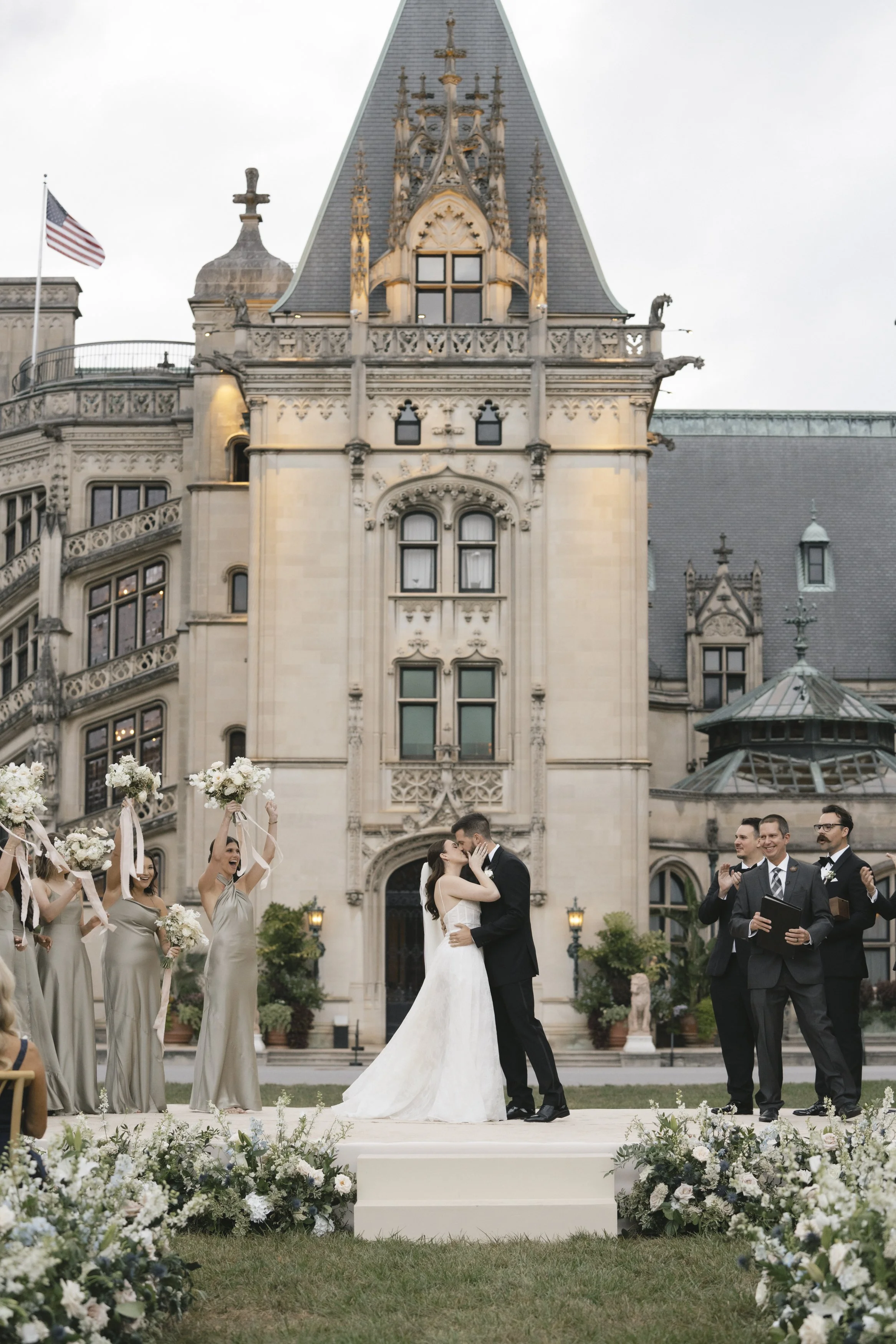 Set against the grandeur of The Biltmore’s historic estate, this wedding was the perfect blend of timeless elegance and personal storytelling. The couple exchanged vows on the front lawn with the iconic architecture as their backdrop, then dined under a tent designed to evoke old world charm—complete with scroll place cards draped from water goblets and custom linen menus at each setting.