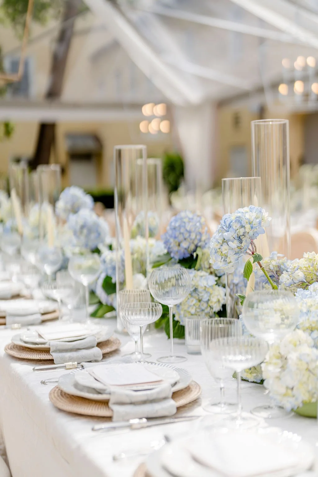 A soft blue palette grounded the design, complemented by touches of ivory, beige, and fresh greenery. Blue hydrangeas took center stage, adding fullness and texture to the reception florals. Tabletops were thoughtfully layered with ribbed glassware, cane chargers, and acrylic flatware—clean, elevated, and effortlessly refined.