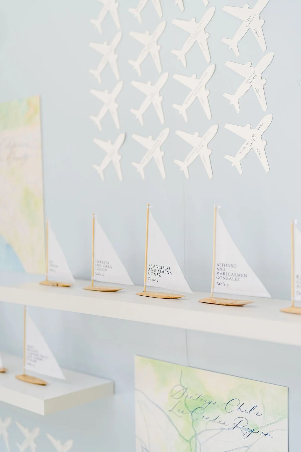 The seating chart was a favorite detail of the day: “By air or by sea, it’ll always be you and me” set the tone, with guests finding their names on delicate sailboats and airplanes, paired with watercolor renderings of the couple’s favorite travel spots.