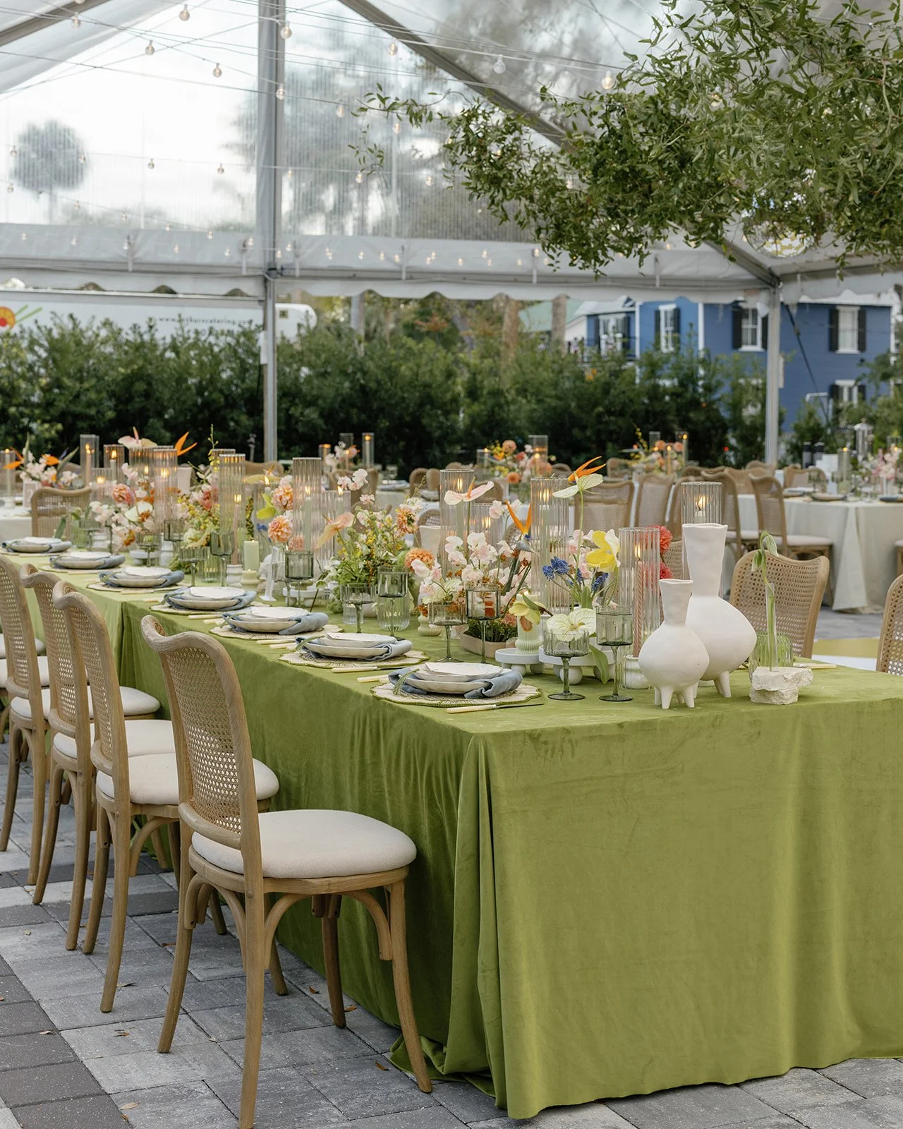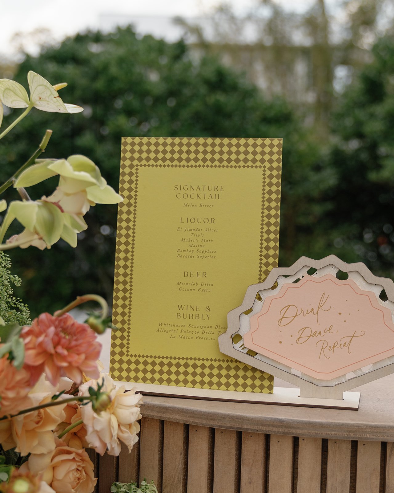 Think non-traditional design, but done with intention—lush greens as the foundation, layered with unexpected pops of sky blue, blush, ivory, and tangerine. Florals carried much of the palette, while thoughtful touches across the tabletop and signage pulled it all together.