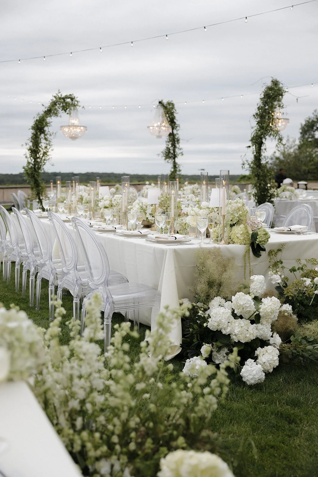 The palette was timeless: ivory, taupe, beige, greenery, and subtle black accents. But the design? Anything but expected. Round tables were configured in a caterpillar-style formation to create the effect of long, winding tables beneath chandeliers suspended from shepherd’s hooks—an elevated twist on traditional layout and lighting.